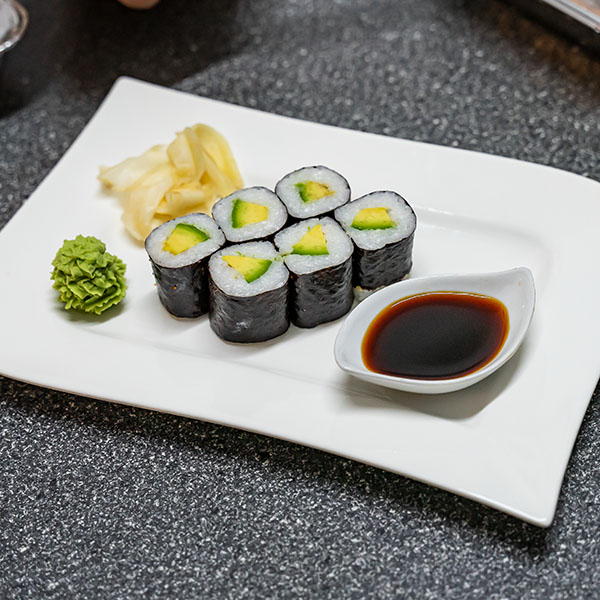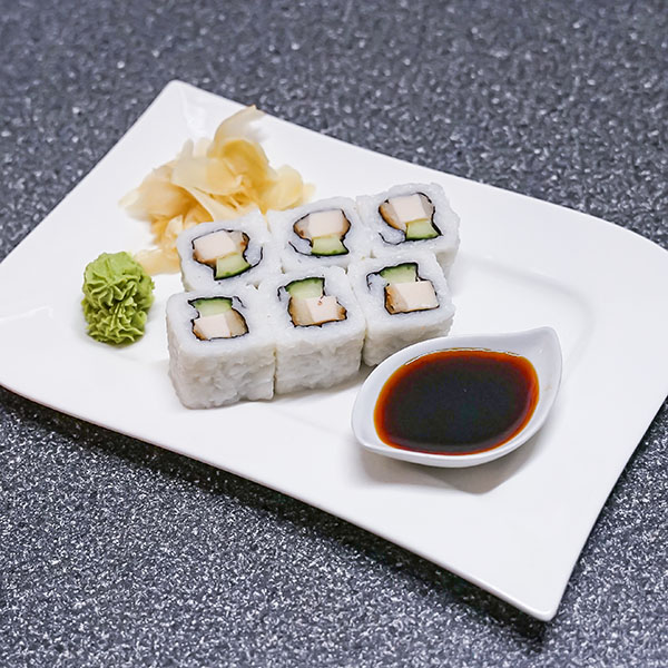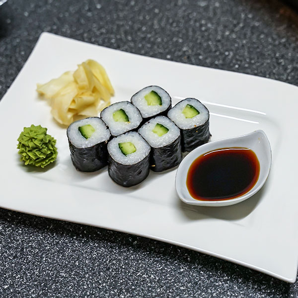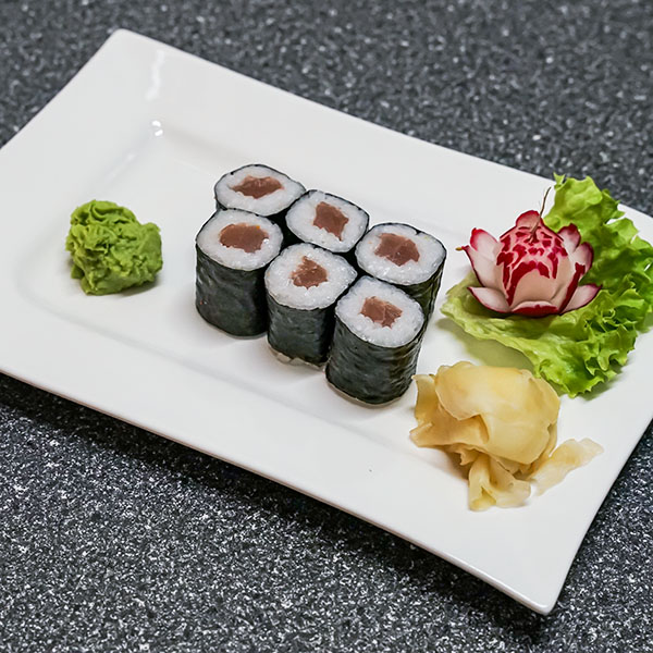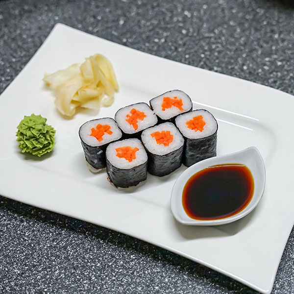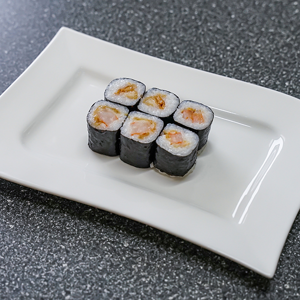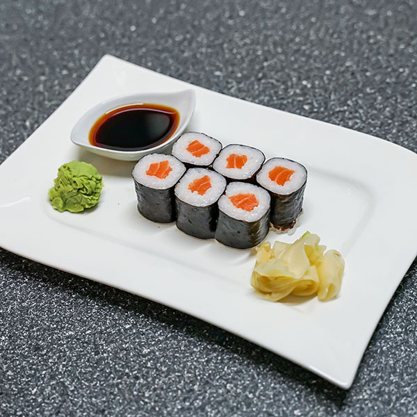 6 Maki (je 2 Röllchen Röllchen mit Lachs, Gurke und Krebsfleisch); 2 Nigiri mit Lachs und Surimi