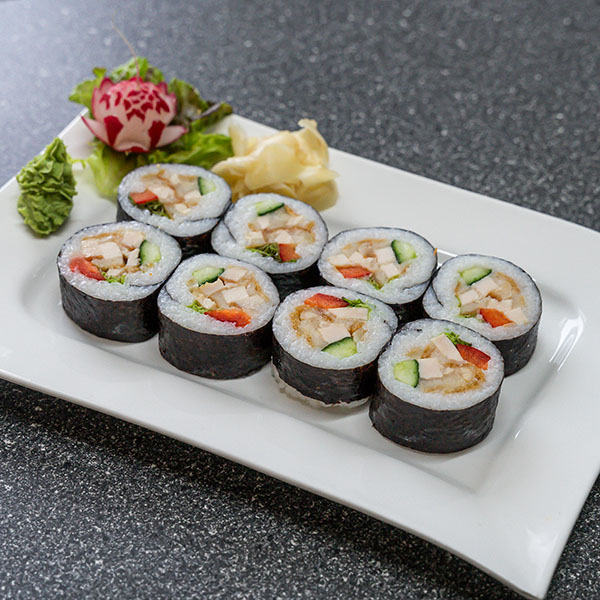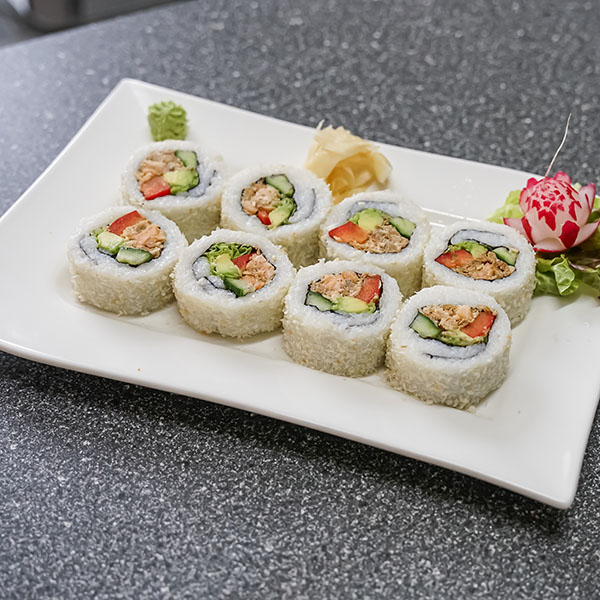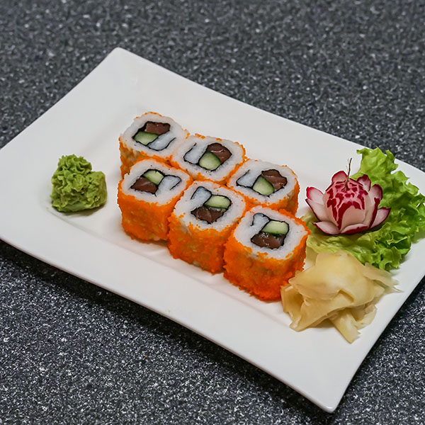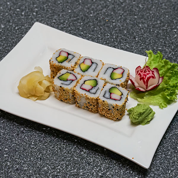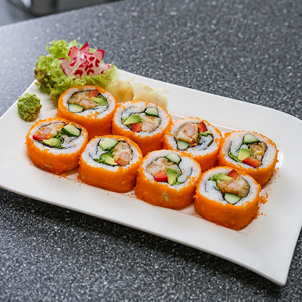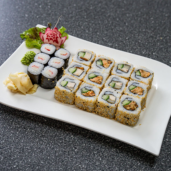 3 Inside Out Röllchen (1 mit Lachs, Gurke, jap. Mayonnaise, ummantelt mit Capelinikaviar; 1 mit paniertem Hühnerfilet, Gurke, jap. Mayonnaise, mit Sesam ummantelt; 1 mit Krebsfleisch, Gurke, jap. Mayonnaise, mit Sesam ummantelt;); 9 Maki (je 3 Röllchen mit Lachs, Gurke und Krebsfleisch); 2 Nigiri mit Lachs und Surimi
