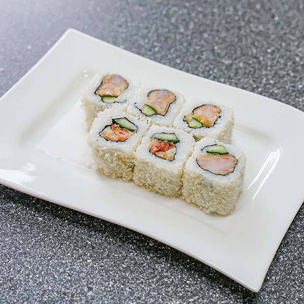 3 Inside Out Röllchen (1 mit Lachs, Gurke, jap. Mayonnaise, ummantelt mit Capelinikaviar; 1 mit paniertem Hühnerfilet, Gurke, jap. Mayonnaise, mit Sesam ummantelt; 1 mit Krebsfleisch, Gurke, jap. Mayonnaise, mit Sesam ummantelt)