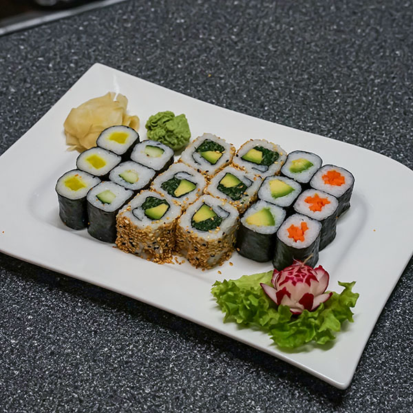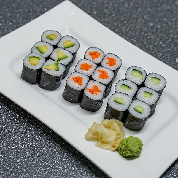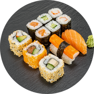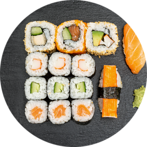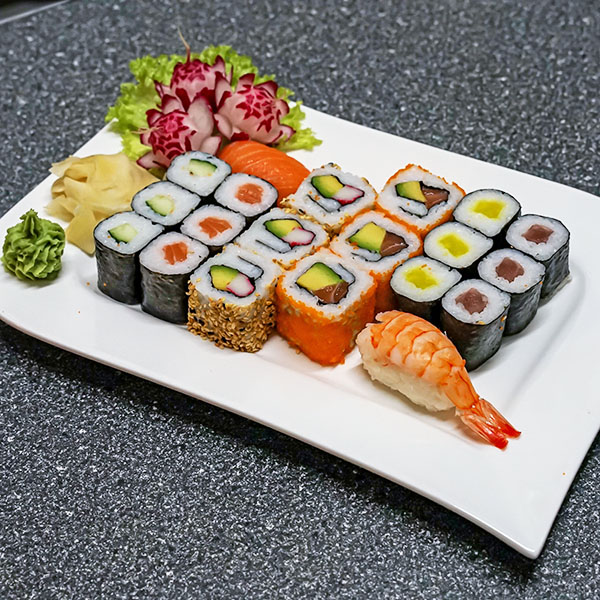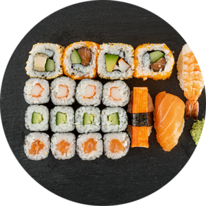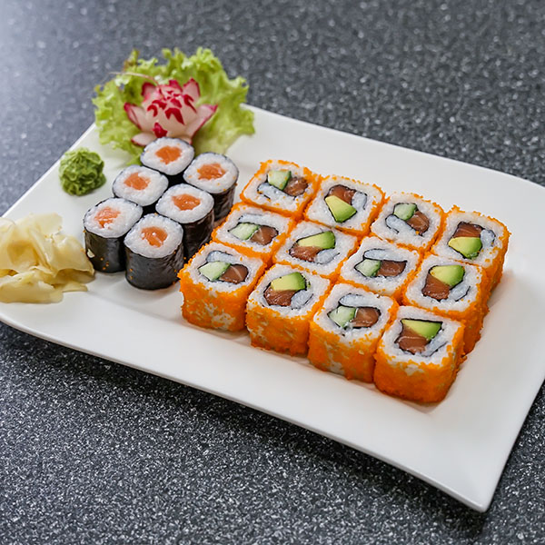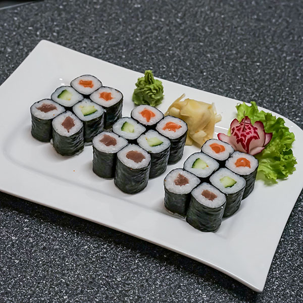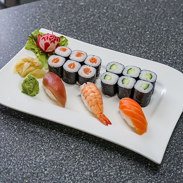 4 Inside Out Röllchen (2 mit Lachs, Gurke, jap. Mayonnaise, ummantelt mit Capelinikaviar; 2 mit paniertem Hühnerfilet, Gurke, jap. Mayonnaise, mit Sesam ummantelt); 12 Maki (je 4 Röllchen mit Lachs, Gurke und Krebsfleisch); 3 Nigiri mit Lachs, Surimi und Garnelen